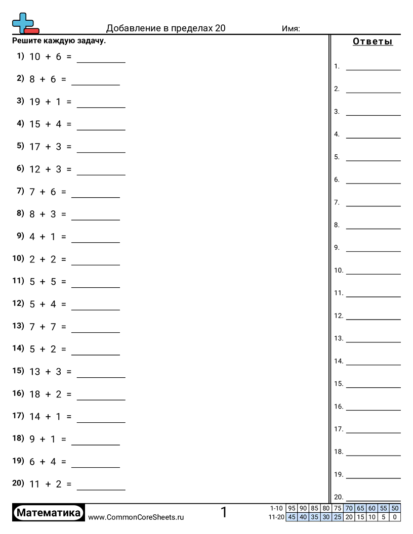 Бесплатные рабочие листы по math для 1 класс (1oa6) по теме Добавление в пределах 20. В каждом листе 20 заданий с ответами; подходит для учителей и домашнего обучения. Вы можете скачать PDF, создать карточки или использовать для онлайн-обучения.