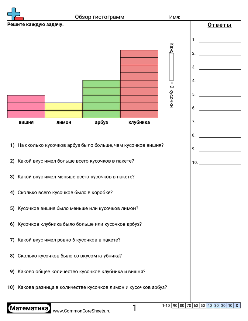 Бесплатные рабочие листы по math для 2 класс (2md10) по теме Обзор гистограмм. В каждом листе 10 заданий с ответами; подходит для учителей и домашнего обучения. Вы можете скачать PDF, создать карточки или использовать для онлайн-обучения.