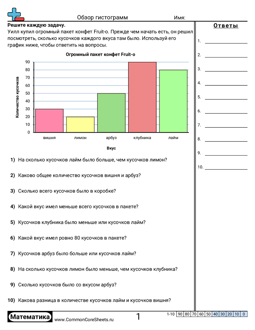 Бесплатные рабочие листы по math для 3 класс (3md3) по теме Обзор гистограмм. В каждом листе 10 заданий с ответами; подходит для учителей и домашнего обучения. Вы можете скачать PDF, создать карточки или использовать для онлайн-обучения.
