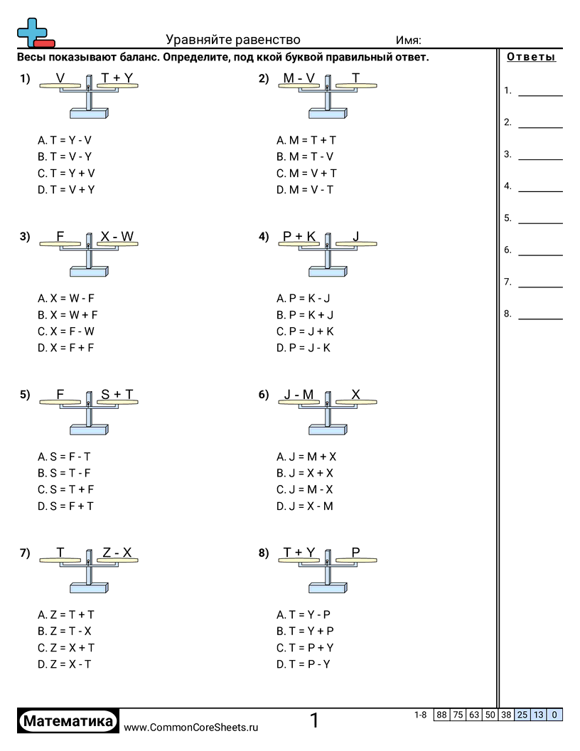 Бесплатные рабочие листы по math по теме Уравняйте равенство. В каждом листе 8 заданий с ответами; подходит для учителей и домашнего обучения. Вы можете скачать PDF, создать карточки или использовать для онлайн-обучения.