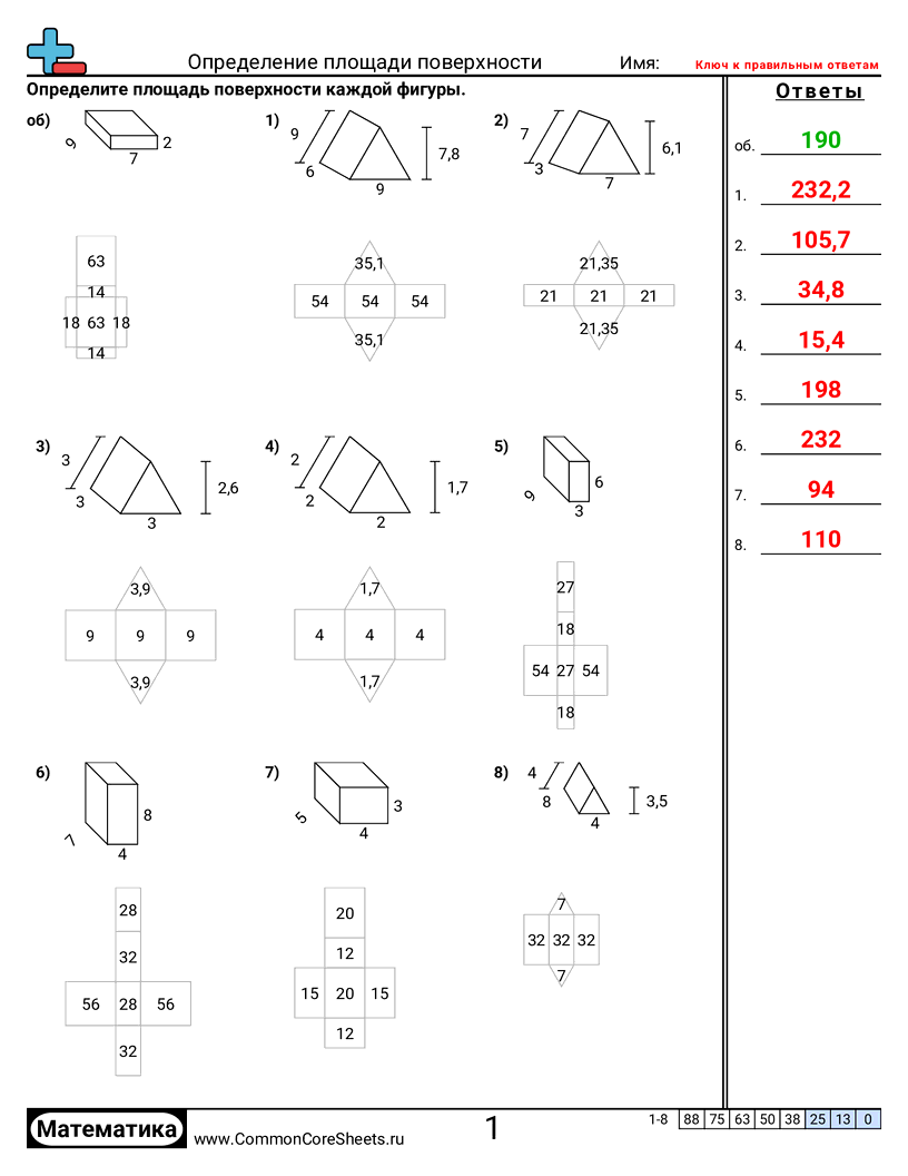 Каждый рабочий лист имеет 8 задач на нахождение площади поверхности фигур.