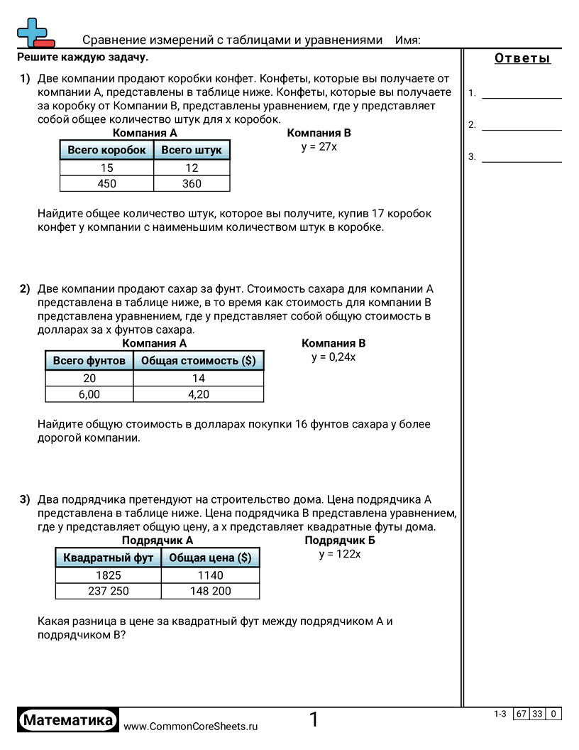 Бесплатные рабочие листы по math для 8 класс (8ee5) по теме Сравнение измерений с таблицами и уравнениями. В каждом листе 3 заданий с ответами; подходит для учителей и домашнего обучения. Вы можете скачать PDF, создать карточки или использовать для онлайн-обучения.