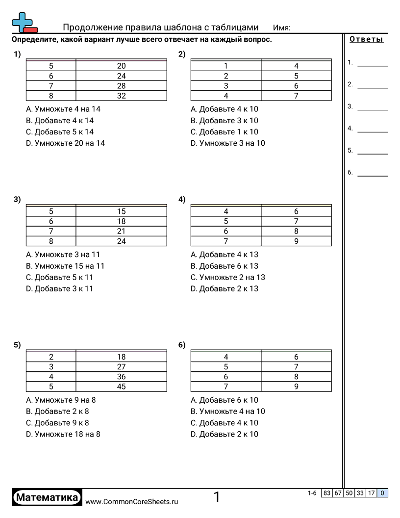 Бесплатные рабочие листы по math по теме Продолжение правила шаблона с таблицами. В каждом листе 6 заданий с ответами; подходит для учителей и домашнего обучения. Вы можете скачать PDF, создать карточки или использовать для онлайн-обучения.