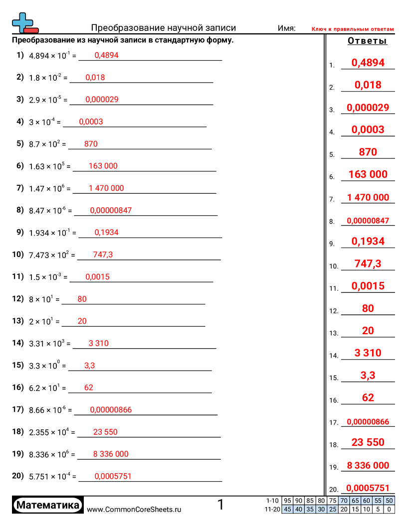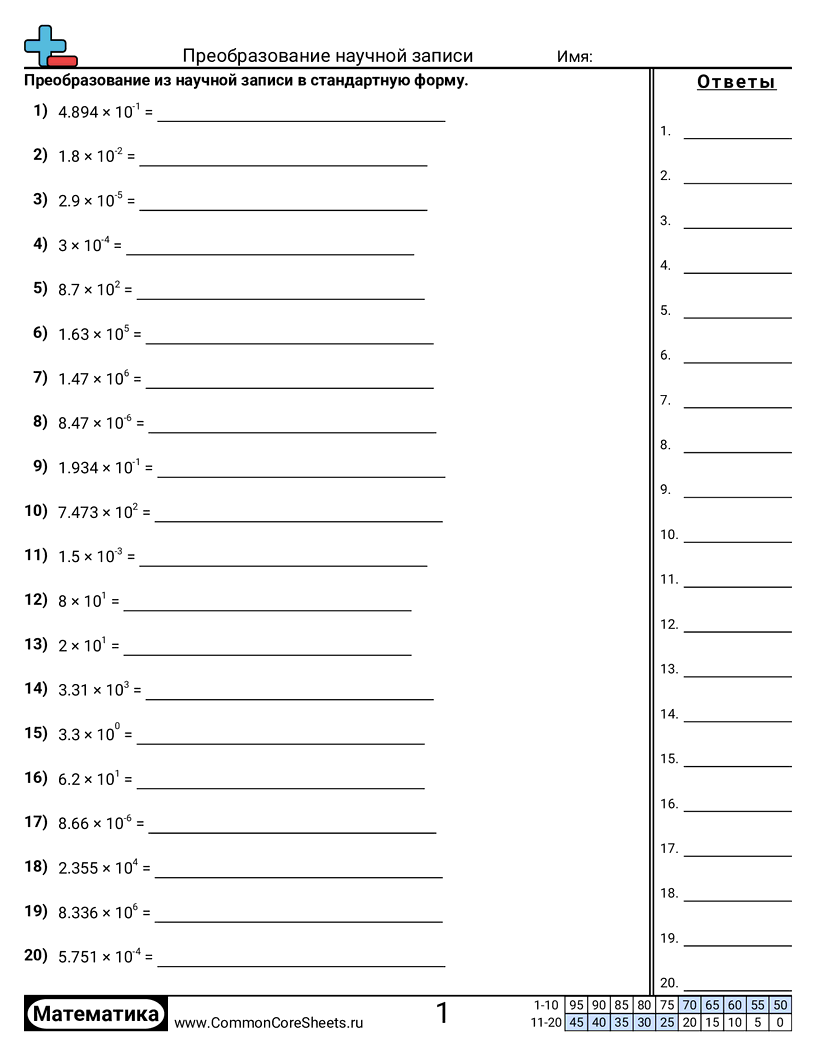 Бесплатные рабочие листы по math по теме Преобразование научной записи. В каждом листе 20 заданий с ответами; подходит для учителей и домашнего обучения. Вы можете скачать PDF, создать карточки или использовать для онлайн-обучения.