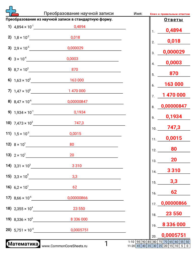Бесплатные рабочие листы по math по теме Преобразование научной записи. В каждом листе 20 заданий с ответами; подходит для учителей и домашнего обучения. Вы можете скачать PDF, создать карточки или использовать для онлайн-обучения.