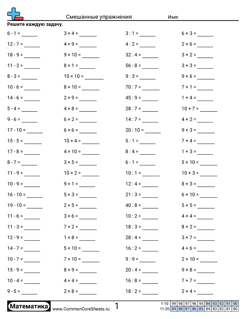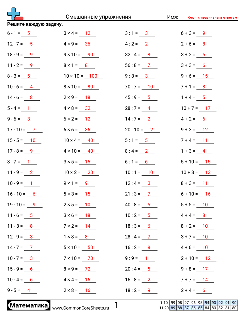 Бесплатные рабочие листы по math по теме Смешанные упражнения. В каждом листе 100 заданий с ответами; подходит для учителей и домашнего обучения. Вы можете скачать PDF, создать карточки или использовать для онлайн-обучения.