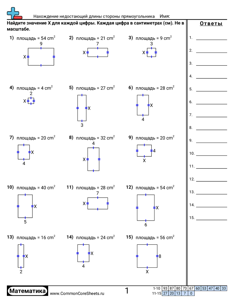 Бесплатные рабочие листы по math по теме Нахождение недостающей длины стороны прямоугольника. В каждом листе 15 заданий с ответами; подходит для учителей и домашнего обучения. Вы можете скачать PDF, создать карточки или использовать для онлайн-обучения.