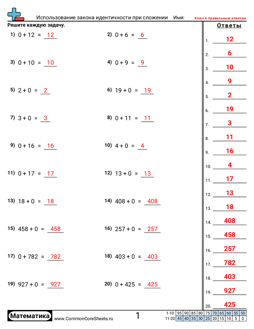 Бесплатные рабочие листы по math по теме Использование закона идентичности при сложении. В каждом листе 20 заданий с ответами; подходит для учителей и домашнего обучения. Вы можете скачать PDF, создать карточки или использовать для онлайн-обучения.