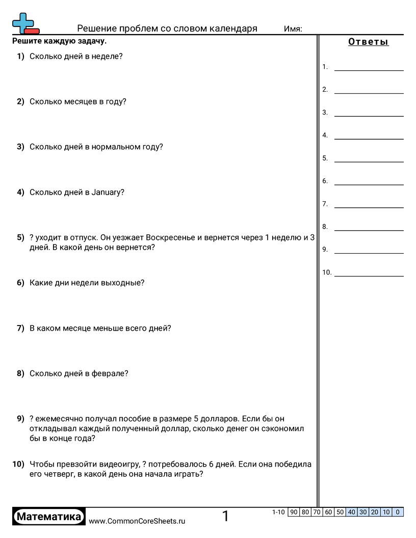 Бесплатные рабочие листы по math по теме Решение проблем со словом календаря. В каждом листе 10 заданий с ответами; подходит для учителей и домашнего обучения. Вы можете скачать PDF, создать карточки или использовать для онлайн-обучения.