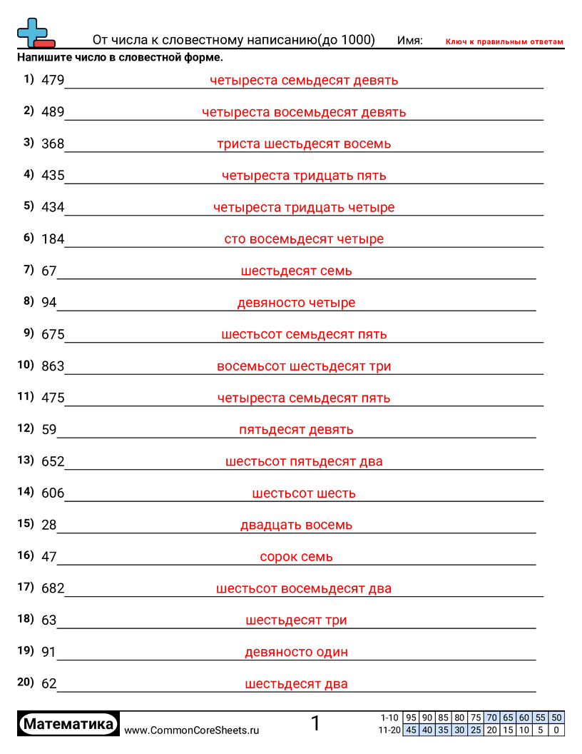 Каждый рабочий лист содержит 20 задач на конвертацию числовой формы в словестную.
