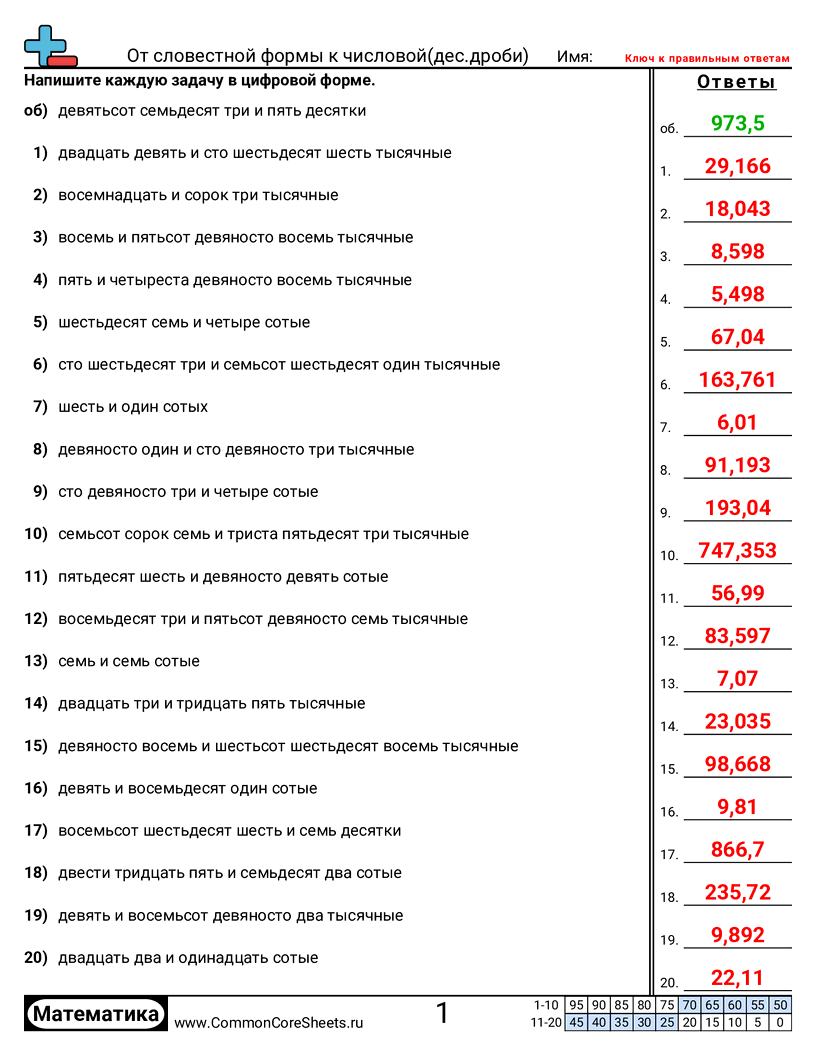 Каждый рабочий лист содержит 20 задач на конвертацию десятичных дробей в числовую форму, в пределах тысячных.