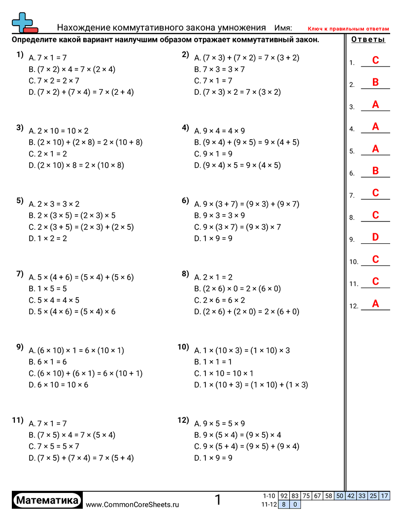 Каждый рабочий лист содержит 12 задач на определение коммутативного закона.