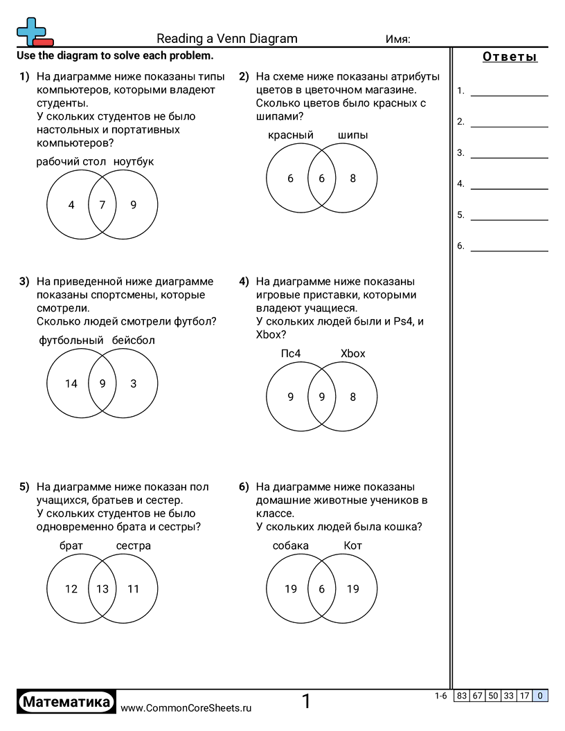 Бесплатные рабочие листы по math по теме Reading a Venn Diagram. В каждом листе 6 заданий с ответами; подходит для учителей и домашнего обучения. Вы можете скачать PDF, создать карточки или использовать для онлайн-обучения.