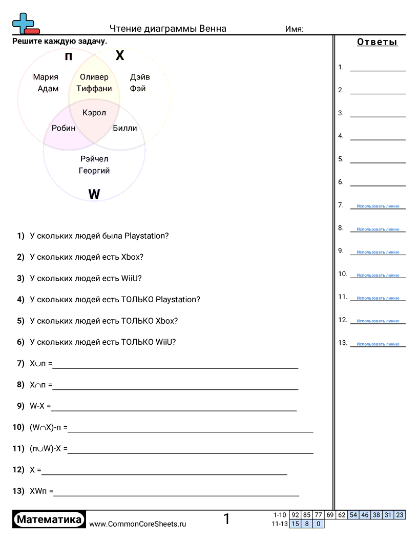 Бесплатные рабочие листы по math по теме Чтение диаграммы Венна. В каждом листе 13 заданий с ответами; подходит для учителей и домашнего обучения. Вы можете скачать PDF, создать карточки или использовать для онлайн-обучения.