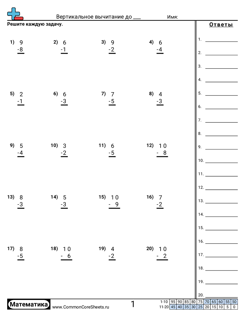Бесплатные рабочие листы по math по теме Вертикальное вычитание до ___. В каждом листе 20 заданий с ответами; подходит для учителей и домашнего обучения. Вы можете скачать PDF, создать карточки или использовать для онлайн-обучения.