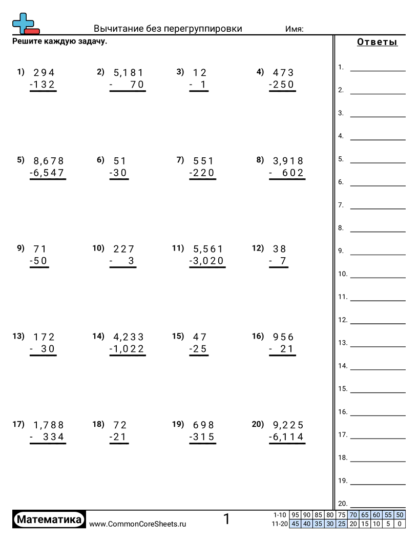Бесплатные рабочие листы по math по теме Вычитание без перегруппировки. В каждом листе 20 заданий с ответами; подходит для учителей и домашнего обучения. Вы можете скачать PDF, создать карточки или использовать для онлайн-обучения.