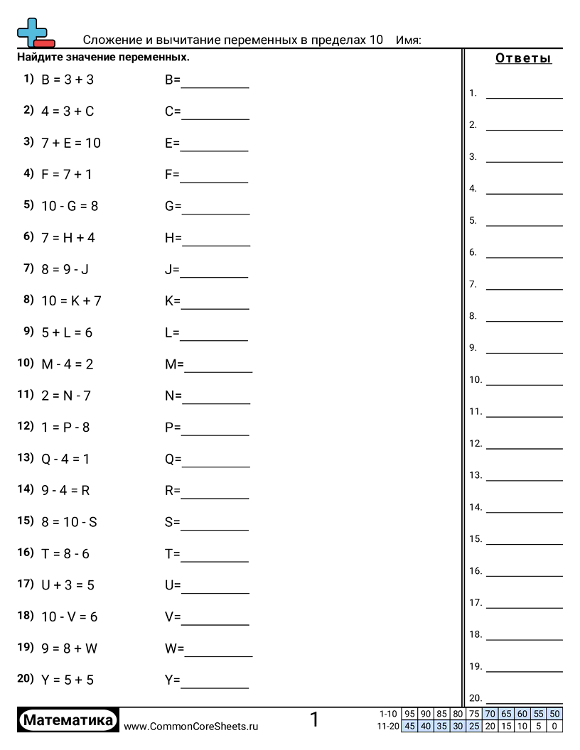 Бесплатные рабочие листы по math для Детский сад (koa2) по теме Сложение и вычитание переменных в пределах 10. В каждом листе 20 заданий с ответами; подходит для учителей и домашнего обучения. Вы можете скачать PDF, создать карточки или использовать для онлайн-обучения.