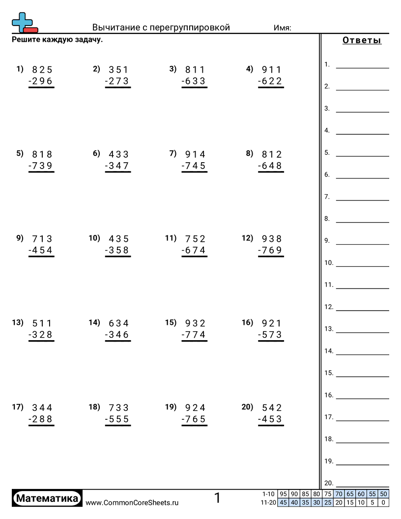 Бесплатные рабочие листы по math по теме Вычитание с перегруппировкой. В каждом листе 20 заданий с ответами; подходит для учителей и домашнего обучения. Вы можете скачать PDF, создать карточки или использовать для онлайн-обучения.