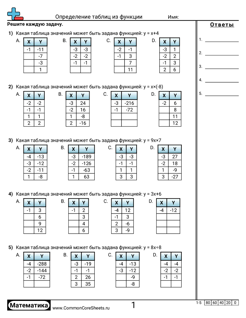Бесплатные рабочие листы по math для 8 класс (8f1) по теме Определение таблиц из функции. В каждом листе 5 заданий с ответами; подходит для учителей и домашнего обучения. Вы можете скачать PDF, создать карточки или использовать для онлайн-обучения.