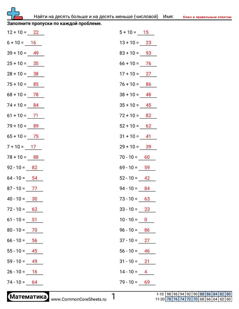 Бесплатные рабочие листы по math по теме Найти на десять больше и на десять меньше (числовой). В каждом листе 50 заданий с ответами; подходит для учителей и домашнего обучения. Вы можете скачать PDF, создать карточки или использовать для онлайн-обучения.