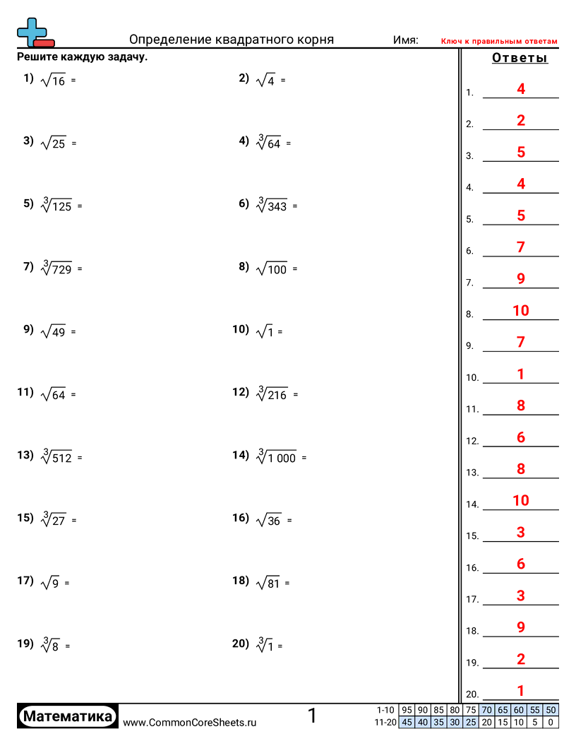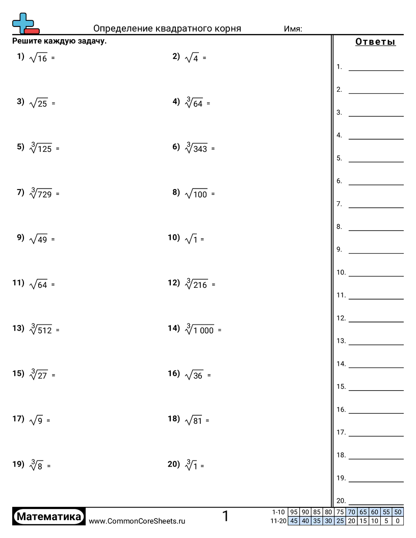 Каждый рабочий лист содержит 20 примеров на нахождение квадратного и кубического корней. Все ответы являются квадратами и кубами.