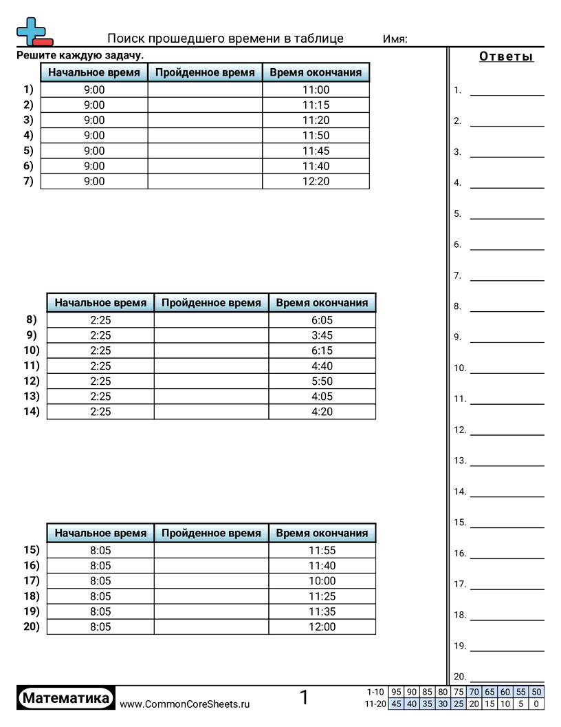 Бесплатные рабочие листы по math по теме Поиск прошедшего времени в таблице. В каждом листе 20 заданий с ответами; подходит для учителей и домашнего обучения. Вы можете скачать PDF, создать карточки или использовать для онлайн-обучения.