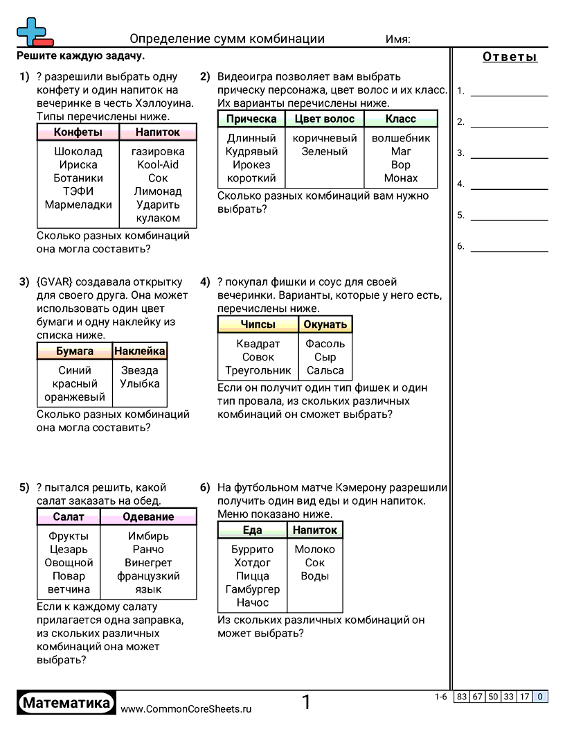 Бесплатные рабочие листы по math по теме Определение сумм комбинации. В каждом листе 6 заданий с ответами; подходит для учителей и домашнего обучения. Вы можете скачать PDF, создать карточки или использовать для онлайн-обучения.