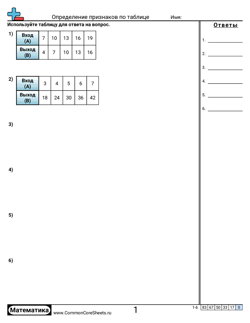 Бесплатные рабочие листы по math для 4 класс (4oa5) по теме Определение признаков по таблице. В каждом листе 6 заданий с ответами; подходит для учителей и домашнего обучения. Вы можете скачать PDF, создать карточки или использовать для онлайн-обучения.