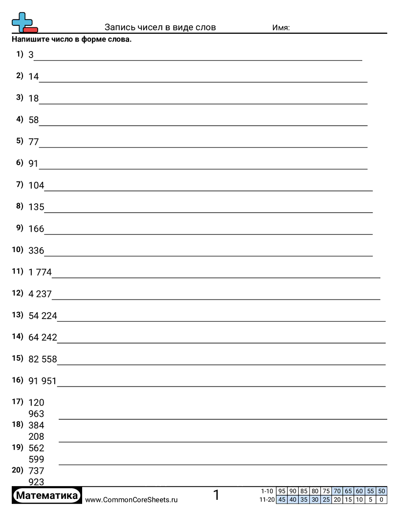 Бесплатные рабочие листы по math по теме Запись чисел в виде слов. В каждом листе 20 заданий с ответами; подходит для учителей и домашнего обучения. Вы можете скачать PDF, создать карточки или использовать для онлайн-обучения.